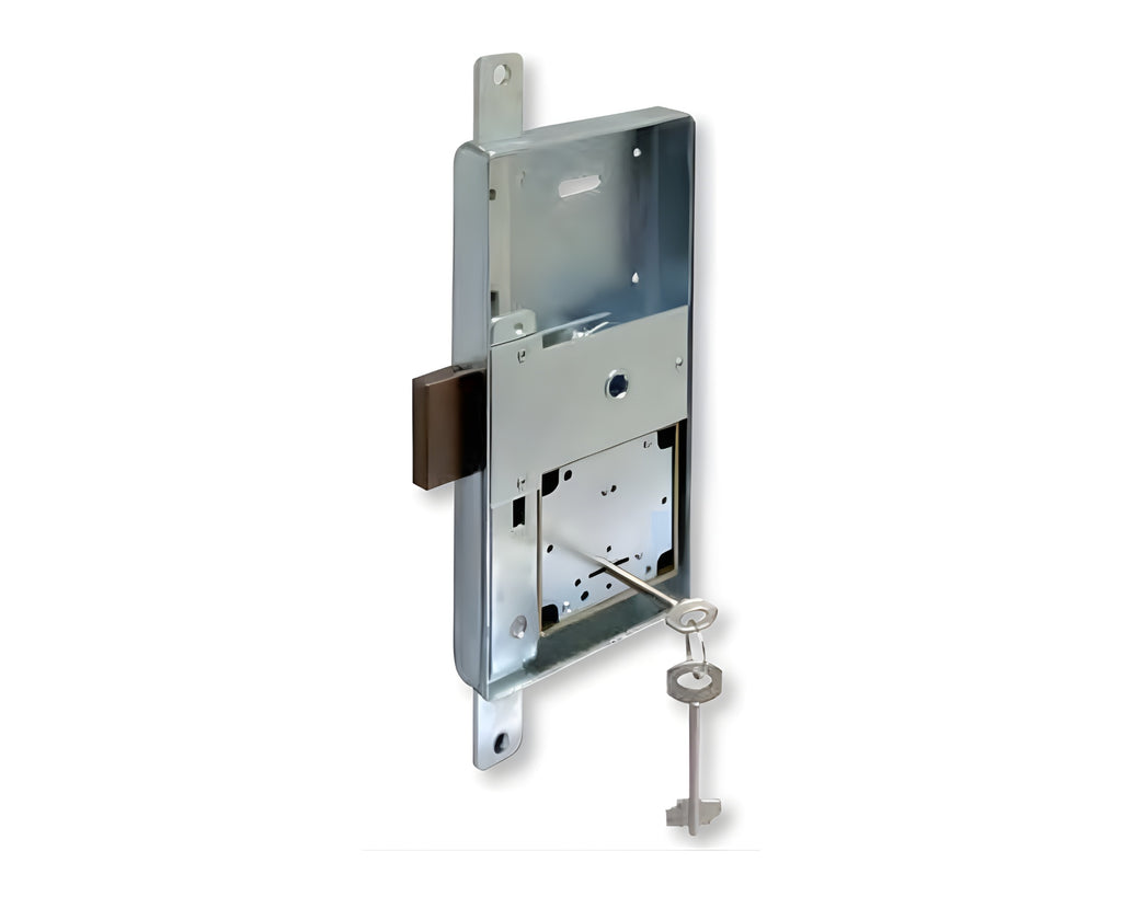 8 leve, chiave unilaterale, chiave inestraibile (a serratura aperta), piastra di montaggio, corazza antiperforazione in acciaio al manganese. Cromozincata, chiavi nichelate. (Trattamenti conformi direttiva 2002/95/CE, RHOS)