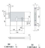 Elettroserratura per fasce, da infilare, entrata 60 mm, frontale 16 mm, altezza corpo 82 mm con scrocco autobloccante, molla del pistone indebolita, FERMO A GIORNO.